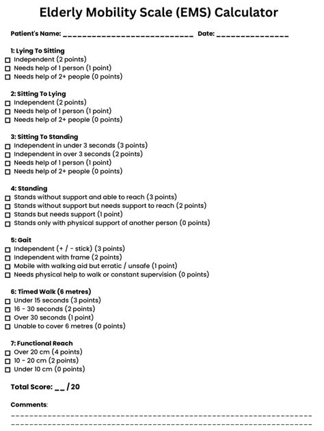 The Aged Mobility Scale is a complete evaluation software particularly designed to judge the purposeful mobility of individuals aged 65 and over. It consists of 10 objects, every addressing a unique facet of mobility, reminiscent of strolling, stairs, and transferring. Healthcare professionals, together with bodily therapists, occupational therapists, and nurses, use the EMS to evaluate people’ skills and supply tailor-made interventions.