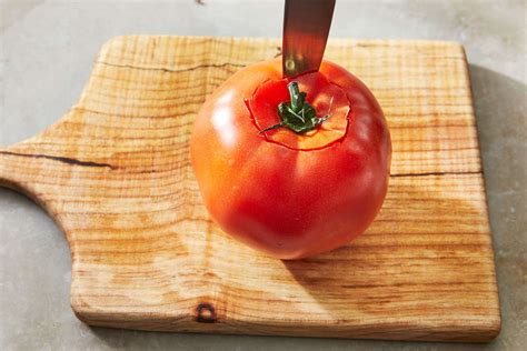 There are a number of completely different methods that you should use to attain a tomato. One widespread approach is to make use of a paring knife to make a shallow minimize across the circumference of the tomato. One other approach is to make use of a spoon to make a small gap within the backside of the tomato, after which use the knife to make a shallow minimize from the outlet to the sting of the tomato.